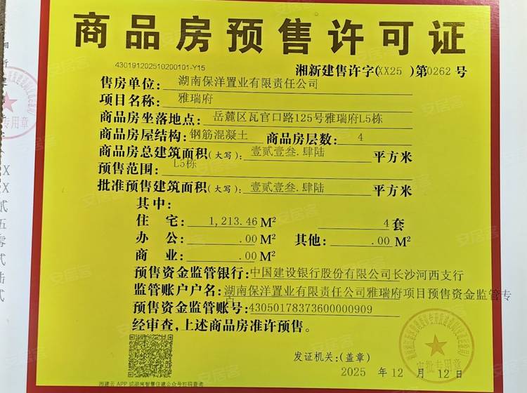 - 湘新建售许字(XX25)第0262号 详情发证时间 2025-12-12绑定楼栋L5#证件照片