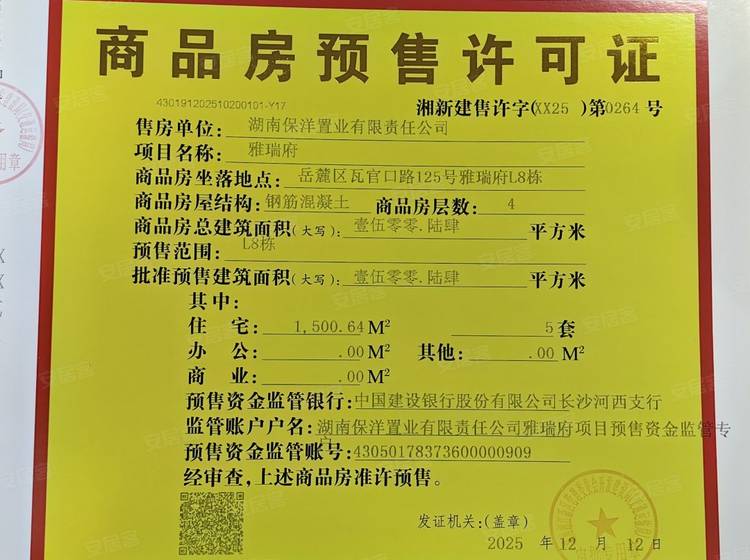 - 湘新建售许字(XX25)第0264号 详情发证时间 2025-12-12绑定楼栋L8#证件照片
