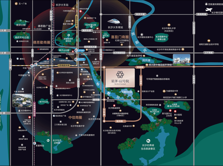 楼盘直线3km范围内有2个一级及以上医院。其中长沙鹤诚医院距离楼盘1.1km,为医疗需求提供了保障。