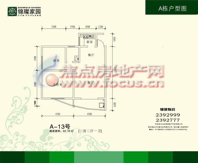 2室2厅1卫-锦璨家园A-13二房二厅一卫92.18平米户型