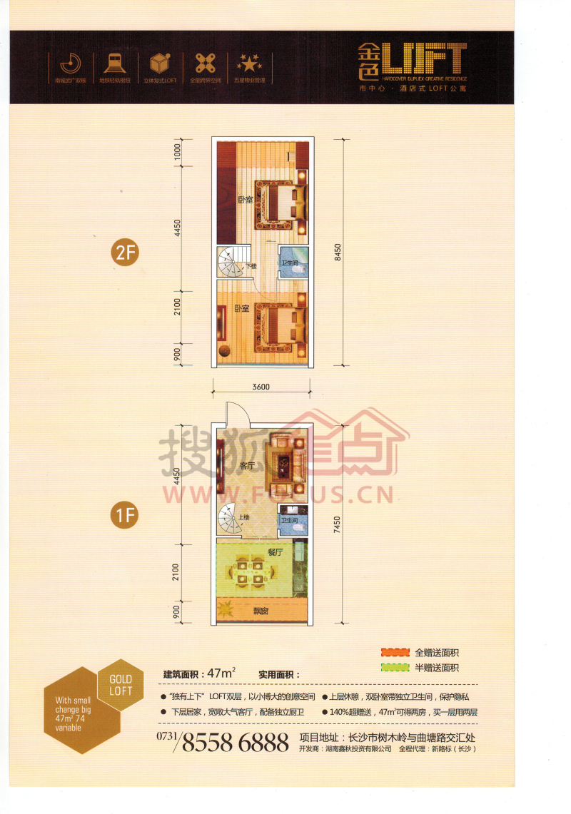 规划设计:双中心地段,创意立体空间,金色loft不仅可以投资居家,更是个人高级商务平台优选。全国品牌酒店进驻,超大空中花园,国际名师担当设计,精装loft高端定制,多台高速电梯、五星级物业贴身服务,指纹识别门禁系统……全奢华智能配套,打造全能型创业基地,让创富梦想从这里起飞。