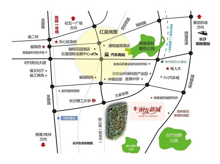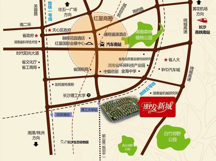 丽发新城与规划中的地铁一号线、长株潭城际铁路快速对接;绕城高速、京港澳高速、107国道通达世界;城市道路无缝对接,30分钟直达长株潭三市中心。
