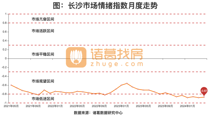 根据诸葛找房数据研究中心监测数据显示,2024年04月,长沙市场情绪指数为-0.87,较上月上升0.01,位于市场低迷区间。