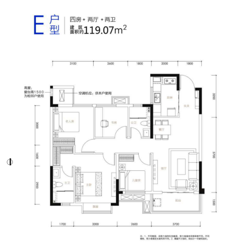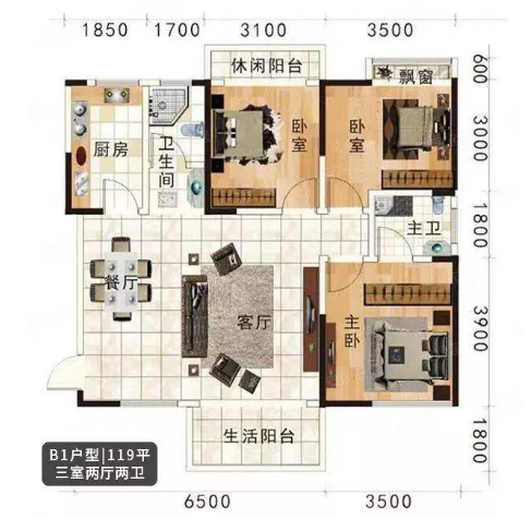 【户型介绍】建面119平户型最紧凑实用的3房2厅2卫,双阳台设计+飘窗,足不出户,尽收风光,明亮卫生间,干湿分离,清新洁净;闲适生活在声与光的伴随中缓缓流消。