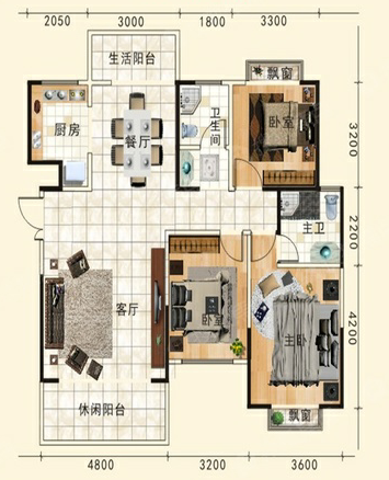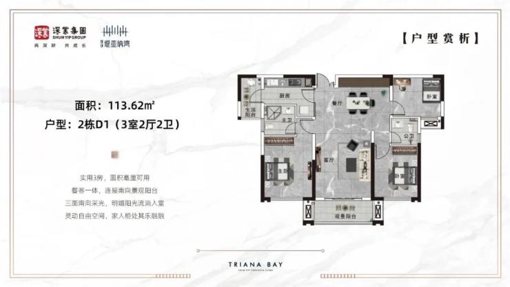 【户型介绍】建面120平户型最舒适的3房2厅2卫,卫双阳台+双飘窗,保证居室采光,健康居家;功能区分合理,动静分离,干湿分区,彰显高性能舒居价值。