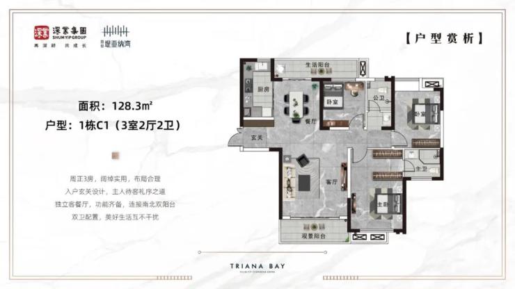 【户型介绍】周正3房,阔绰实用,布局合理入户玄关设计,主人待客礼序之道独立客餐厅,功能齐备,连接南北双阳台双卫配置,美好生活互不干扰。