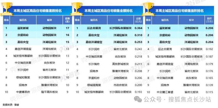 普睿发布的主城区商品住宅成交套数TOP10榜单为:丽发新城、京盛和府、嘉信央玺、嘉信洋湖锦玺、城发恒伟雅郦映、中交瑞启芙蓉、长沙润府、绿城知雅棠、招商序、中建博催府。