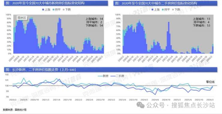 具体来看,2026年3月份全国70大中城市新房房价指数上涨城市数量比2月份增加4个;2026年3月份全国70大中城市二手房房价指数上涨城市数量比2月份增加11个。