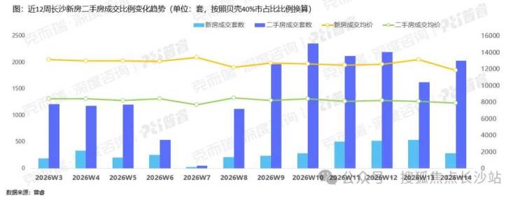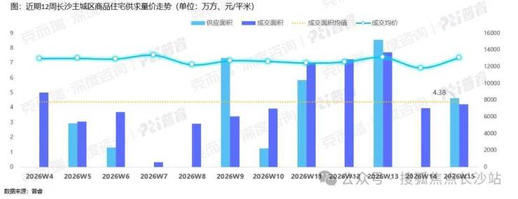 上周(2026年第15周)长沙主城区商品住宅市场成交量从低点上涨到均值附近,量能环比增长6.5%;成交均价13077元/㎡,环比上涨10.3%。