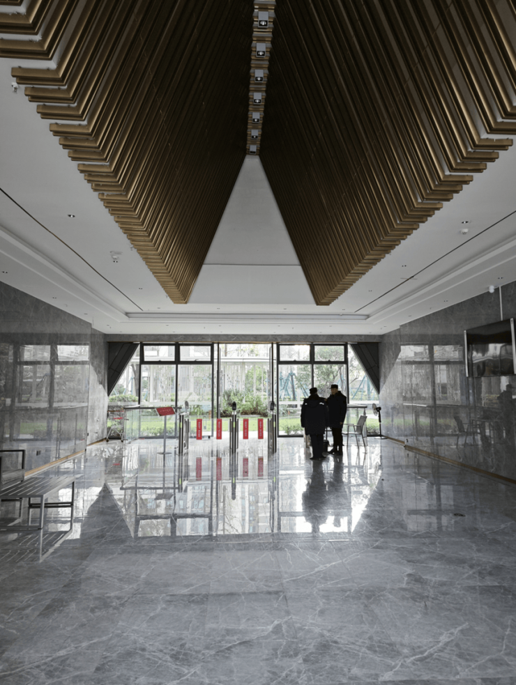 现在在售的新房(对应2024-2025年高房地价差项目)——公区配置完全是另一个级别。楼栋入户大堂往往采用酒店式设计,高挑空间、艺术吊灯、精致石材地面,一进门就有高级感。奢石、铝板等昂贵材料在小区大门的使用频率增加,楼栋外立面采用铝板、金属线条的项目逐渐增加,园林景观植物搭配讲究。地下车库的艺术星空顶、车道吊顶等均成为标配。会所也在很多刚改项目上出现。