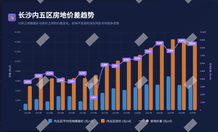 回顾长沙内五区房地价差的变化历程,我们可以清晰地看到一条上升曲线: