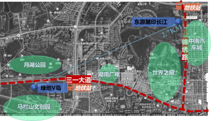 开福区金鹰月湖板块,绿地V岛和东原麓印长江相距不到3公里,都打着"地铁盘"的旗号。
