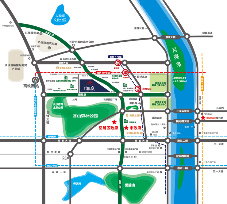 交通:银星路和金星路有数十条公交路线,可直达市中心、西站、北站、梅溪湖等板块;从项目步行15分钟可到地铁4号线湘江新城站,可在溁湾镇换乘2号线。