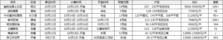 今日长沙8项目认筹,高铁会展片区融创会展上东区14号栋正在认筹中,预售产品为107、142平毛坯住宅,均价9000-9500元/平,共100余套房源,预计下周开盘。月亮岛附近润和雅郡1号栋正在认筹中,预售产品为118-150平毛坯住宅,均价7700元/平,仅96套房源,有需要的购房者需抓紧上车。