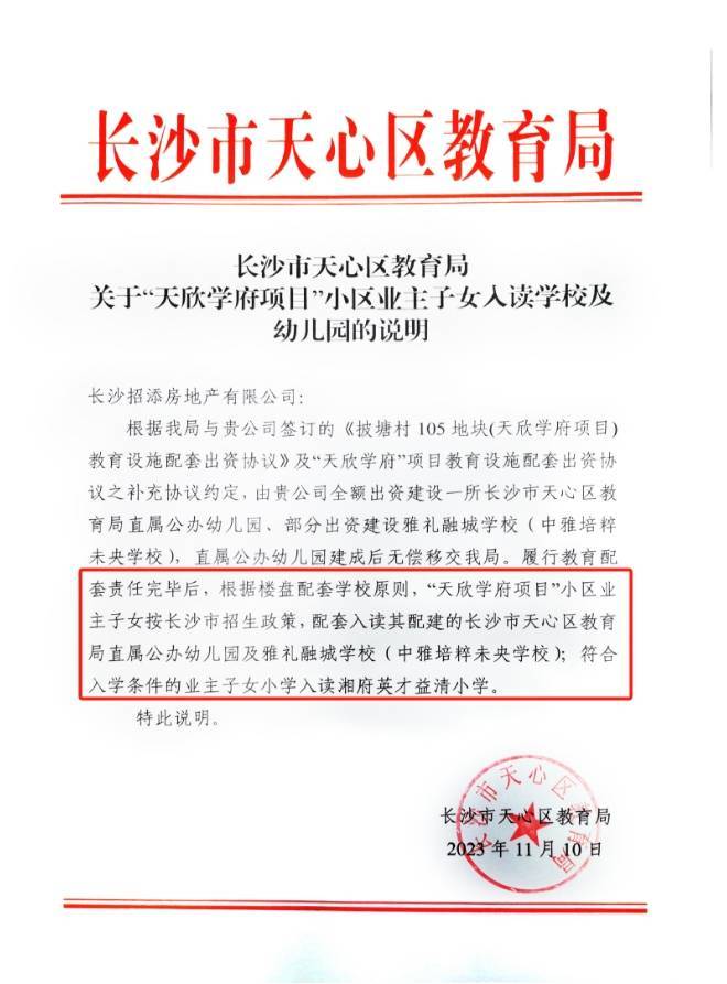 据了解,项目自建托儿所(在建中)以及9班制幼儿园(在建中,天心区教育局直属公办幼儿园),配套入读天心区教育局直属公办幼儿园(在建中)及中雅培粹未央学校(规划中),符合入学条件入读湘府英才益清小学。