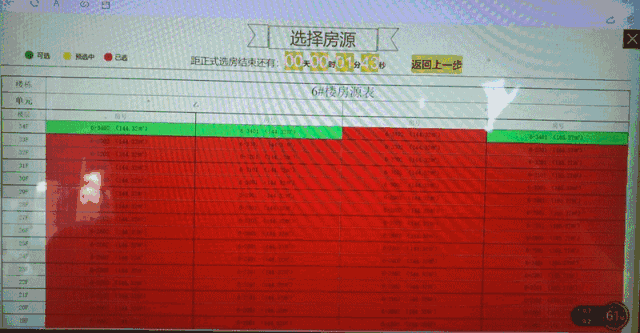 这是华润国际社区六期的收官房源,上图中展现的是首轮全款客户选房,近80%的房源被全款客户选完,剩余绿色色块房源则由二轮贷款客户进入选择,所有房源当晚即被全部选定,今天则去售楼处现场签约。