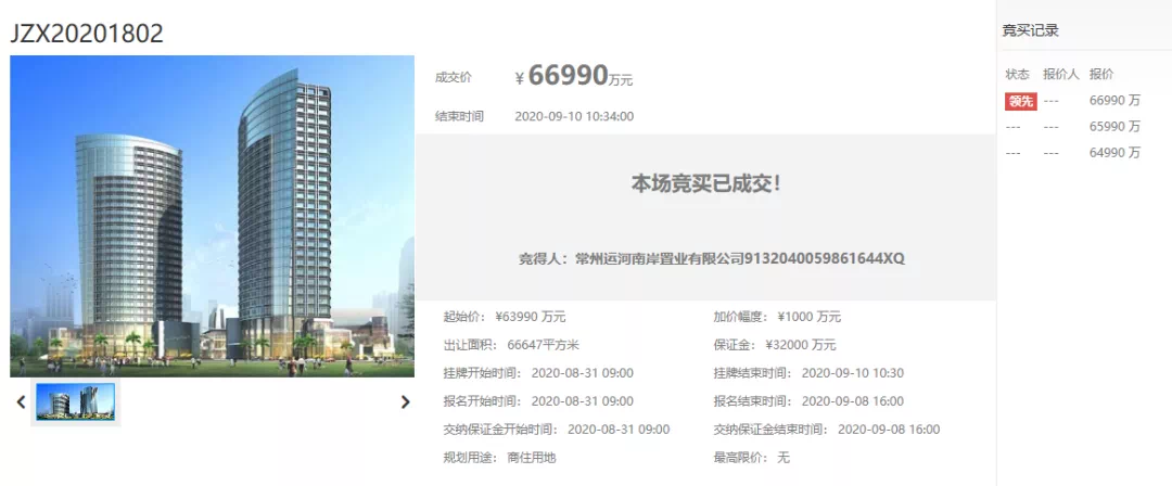 该地块以66990万元的价格正式成交,竞得房企为运河南岸置业,楼面价5584元/㎡,溢价率为5%,住宅回购价13500元/㎡。