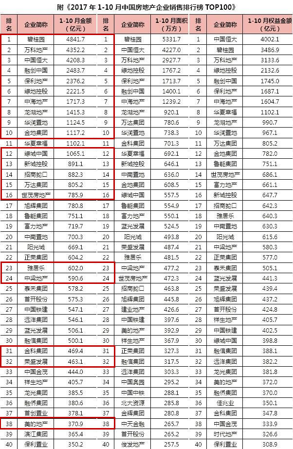 在中国房地产测评中心统计和整理的《1-10月中国房地产企业销售排行榜TOP100榜单》中,从成交金额排行榜来看:
