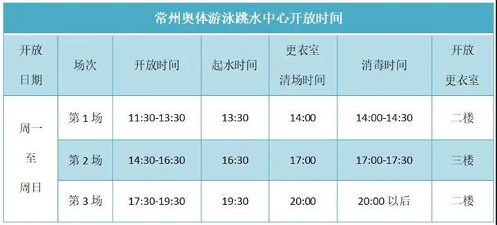 据了解,为切实做好“新冠肺炎”疫情防控工作,有序恢复正常生产生活秩序,满足广大市民健身需求,常州奥体游泳跳水中心将于2020年5月18日起进行分时段开放。相关信息如下: