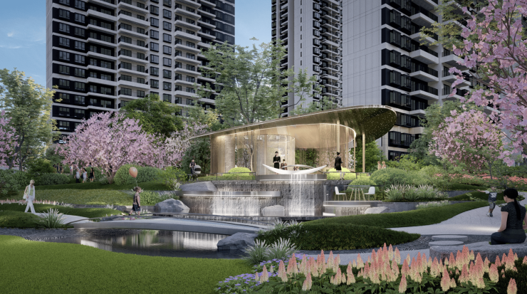 约6000m²中央会客厅(约等于14个篮球场大小),覆盖约600+棵乔木、50+种植被,打造家门口的景观公园。中央会客厅由一座景亭、三层叠水景观,阳光草坪、艺术雕塑小品、一座跨溪石桥、观赏绿植组团和散落的休闲区域构成。