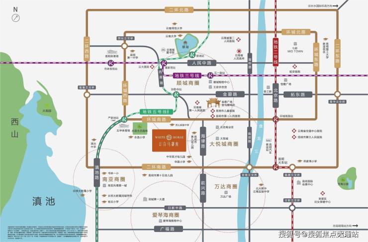 【商业】向北有顺城王府井商圈,东有大悦城商圈,南邻万达双塔、润城第一大道商圈,西连南亚风情第壹城商圈,东南西北四大成熟商圈汇聚了全昆明最齐全的娱乐休闲品牌,而且距离项目1.5KM以内,步行即可到达。