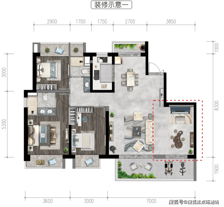 A1户型:建筑面积约168㎡,四室两厅两卫
