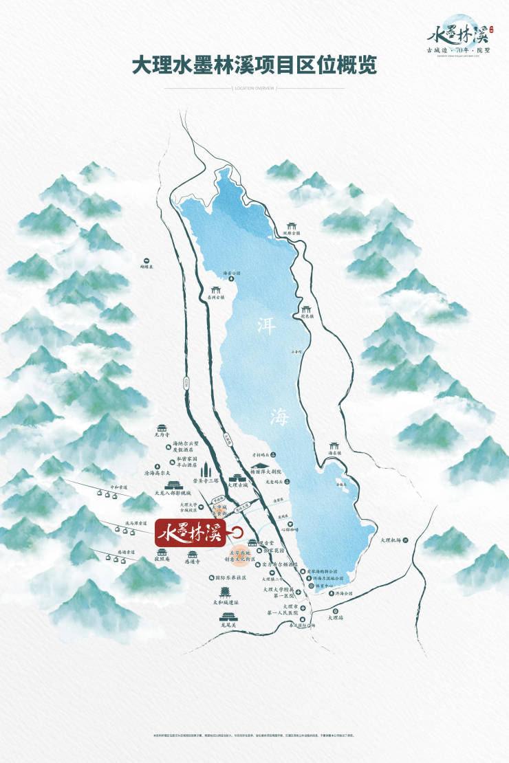 水墨林溪项目占地5.4万方,东侧为苍山大道,背靠苍山,面临洱海,具有丰富的旅游资源,大理主要的风景区,包括4A级景区大理古城、洱海、苍山地质公园、3A级景区张家花园、感通寺、观音塘、感通索道、崇圣寺三塔、蝴蝶泉等等20多个景点几乎都集中在项目周边。