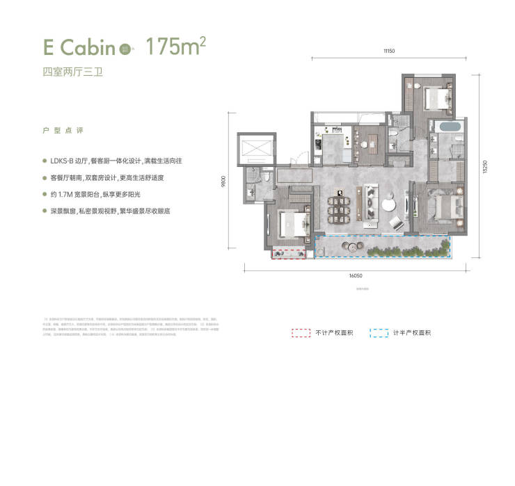 LDKS-B餐客厨一体化,空间舒阔,功能多变;大层高、大面宽、大进深阳台,生活无界;独立收纳储藏间。