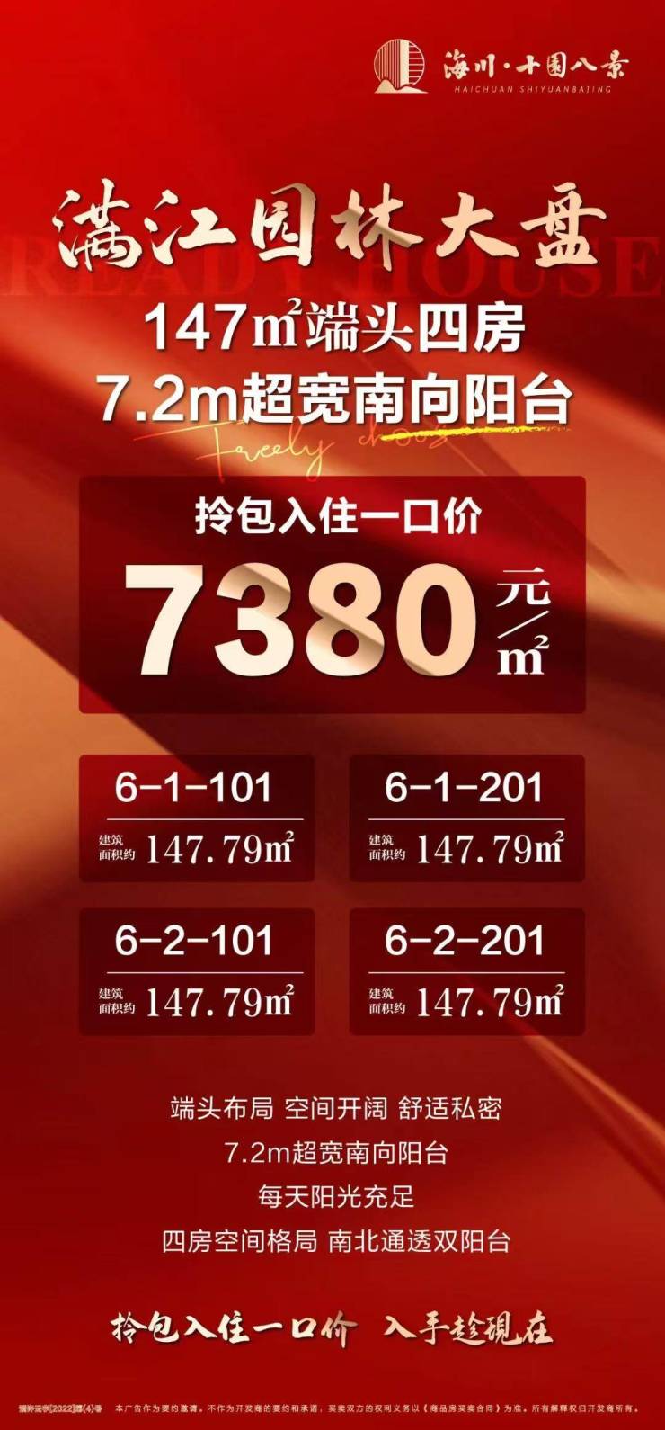 海川·十园八景,建面约147㎡端头四房,拎包入住一口价约7380元/㎡起!关注海川·十园八景的朋友可前往售楼处现场看房,咨询房源信息请拨打电话400-156-0036 转 426610!