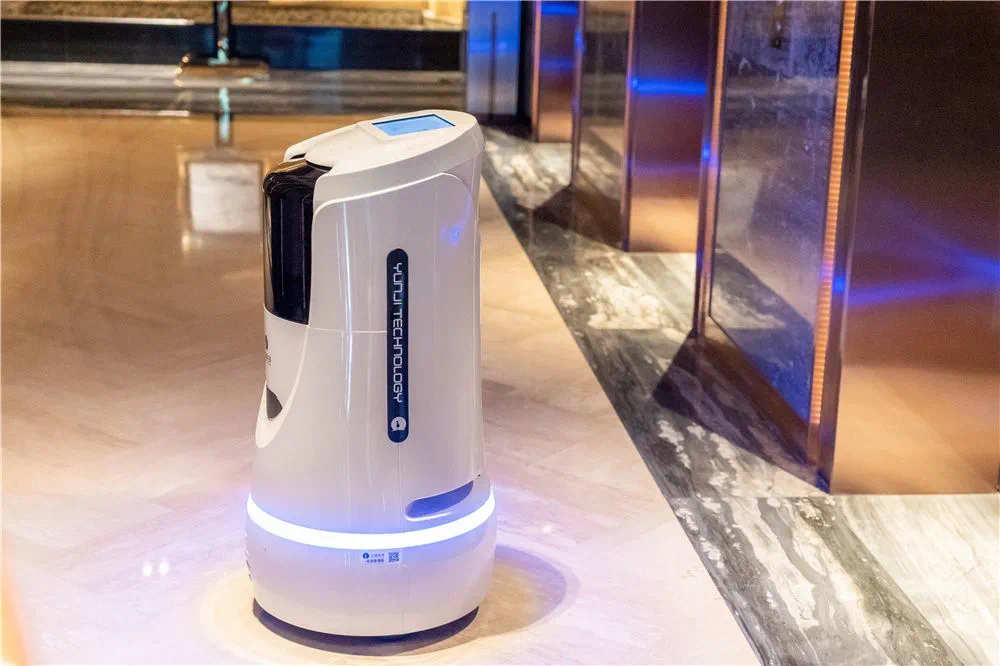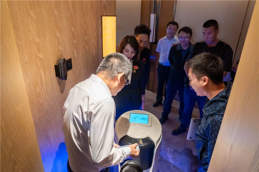 在智慧服务方面,机器人服务方阵将应客人需求,为客人提供引领、送物、快递、外卖等服务。客人可以在大堂开启“引领”服务,机器人将直接带领客人乘坐电梯,到达入住房间门口;在客房内发起服务需求后,比如“送物”,机器人会将客人所需物品送到入住房间门口,送水、点餐、取快递等服务都可以实现。