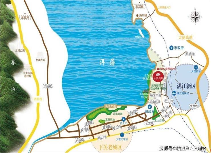 项目延机场路向北6公里,车程10分钟到达大理机场;项目东南面0.5公里处为 大理高铁“洱海站”(建设中),开车5分钟内即可到达;大理火车站位于下关城区内,离项目6公里左右,车程约15分钟左右。
