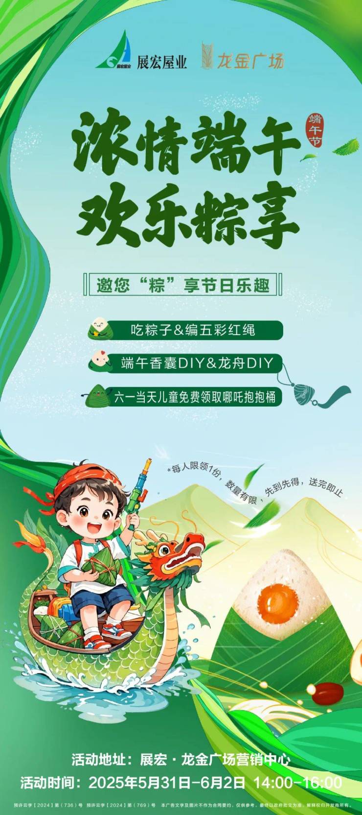 为回馈客户热情,龙金广场重磅释放“样板间开放专属购房福利”, 礼遇全城不容错过,同时在端午假期期间,5月31日-6月2日,营销中心还将举办端午节非遗体验活动,欢迎大家前来参与。