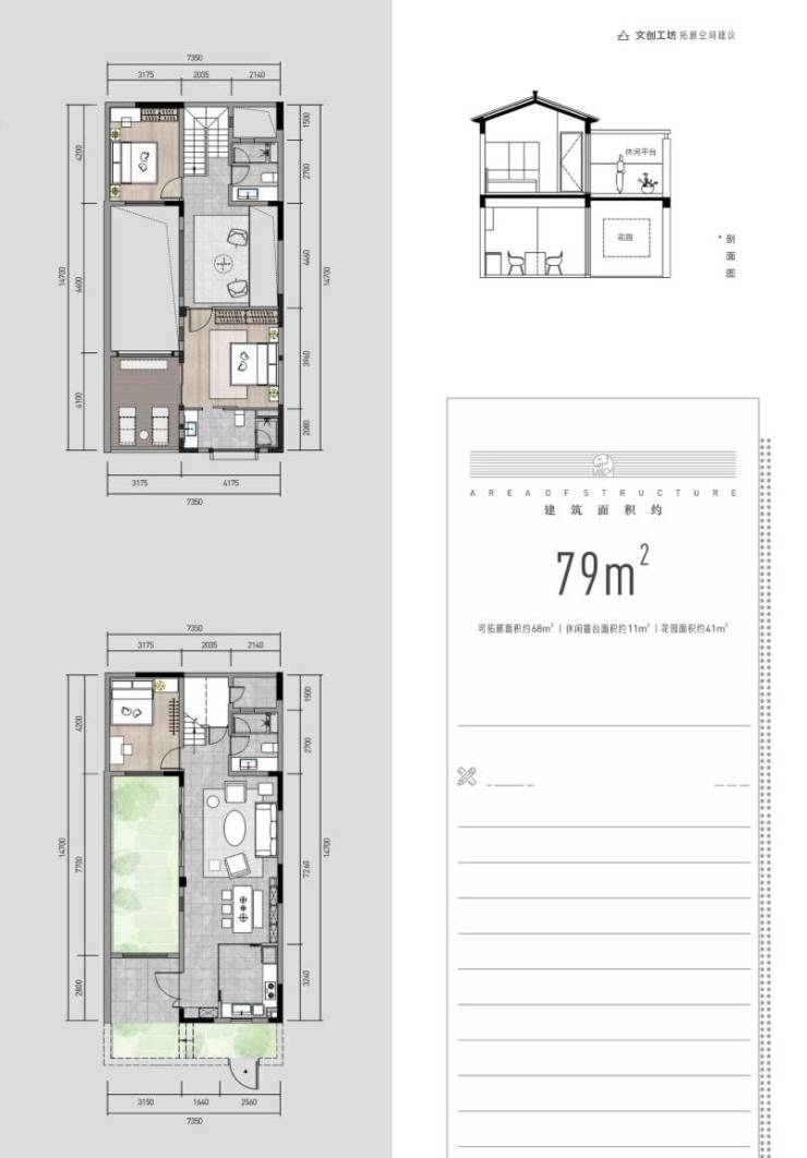 建筑面积约79㎡,实际使用面积约158㎡和花园面积约41㎡