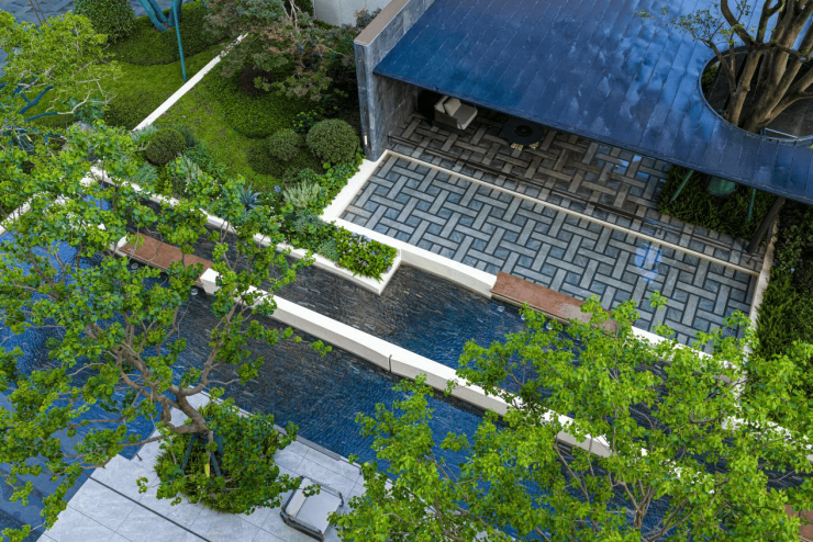【景观园林】提取自大理文脉与白族文化,营造 “寻音•山林间、拾音•云水处、回音•层云上”三大主题景观。栽种山茶、银杏、冬樱花等四季珍贵苗木,辅以奢石造景,营造层次分明的四季景观,构建人与自然的生活意境。