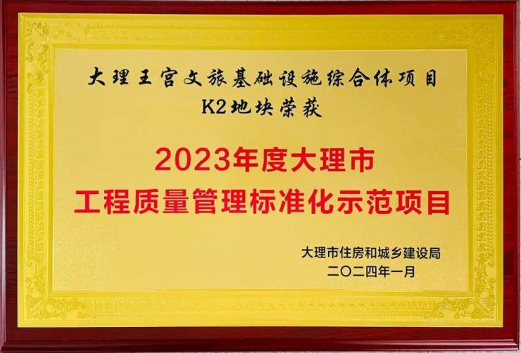 此次大理王宫项目 K2地块获评大理市2023年度工程质量管理标准化示范项目、安全生产标准化工地,是地州城市公司高度重视项目质量安全的结果,为公司项目质量安全工作起到良好的示范作用。 2024年,地州城市公司将持续发扬项目建设“工匠精神”,努力打造一流精品工程,树立文旅地产项目标杆。