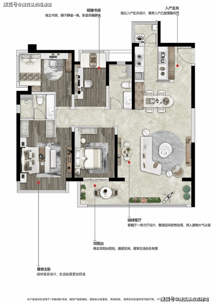 户型亮点:动静分区合理布局+约10.4米揽景阳台+独立入户玄关+双套房设计