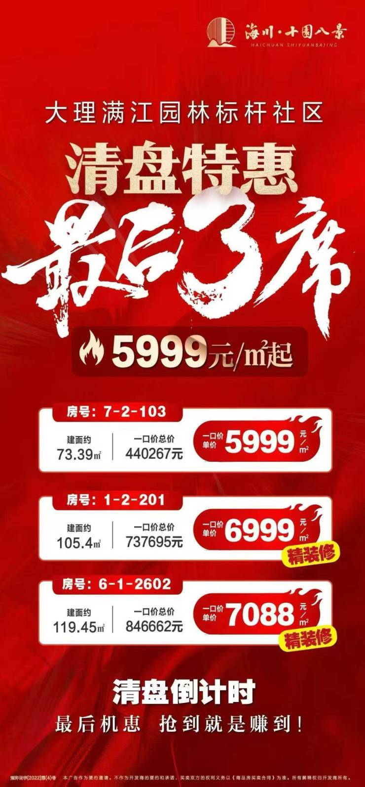 海川·十园八景,大理满江园林标杆社区,清盘特惠房源推荐,一口价单价约5999元/㎡起!关注海川·十园八景的朋友可前往售楼处现场看房,咨询房源信息请拨打电话400-156-0036 转 426610!