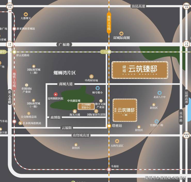 昆明绿城云筑臻邸是绿城管理代建与东方资产联合开发的高品质住宅项目,位于官渡区新螺蛳湾片区广卫站地铁口附近,具有以下核心特点: