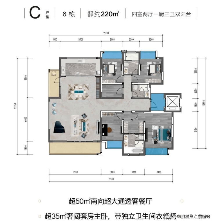 C户型 建面约220㎡ 四室两厅一厨三卫双阳台