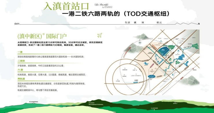 一港:昆明长水国际机场;二铁:沪昆高铁、渝昆高铁;六路:杭瑞高速、嵩昆大道、空港大道、绕城高速、嵩昆高速、320国道;两轨:新区轨道2号线以及嵩明快线。项目内部有6条主干道,分别为沐春大道、栖夏大道、颂秋大道、吟霜大道、彩韵大道、渲花大道,整体以春夏秋冬为主题,并配合不同的树木花卉,营造四季多彩的生活体验。