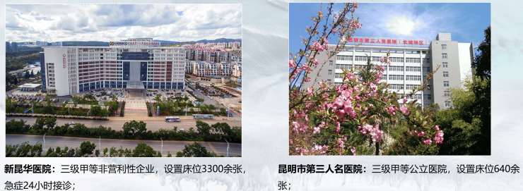 已经落地运营的新昆华医院,是依托云南省第一人民医院的整体资源,集基本医疗、专科医疗、特需医疗、康复、医疗国际交流与合作为一体的大型三级甲等综合性医院;