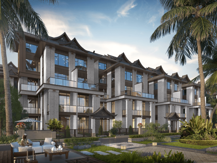 项目外立面采用的是时下最流行的新亚洲建筑风格,提炼当地特色民族元素并融入现代时尚艺术风格,外立面色调以冷灰色为主,合理搭配咖啡色,采用高雅的外墙真石漆。整体建筑充分考虑人居需求,各种元素和谐共存,兼容并蓄,为业主创造出了亲切、现代、舒适、典雅的高端旅居社区。