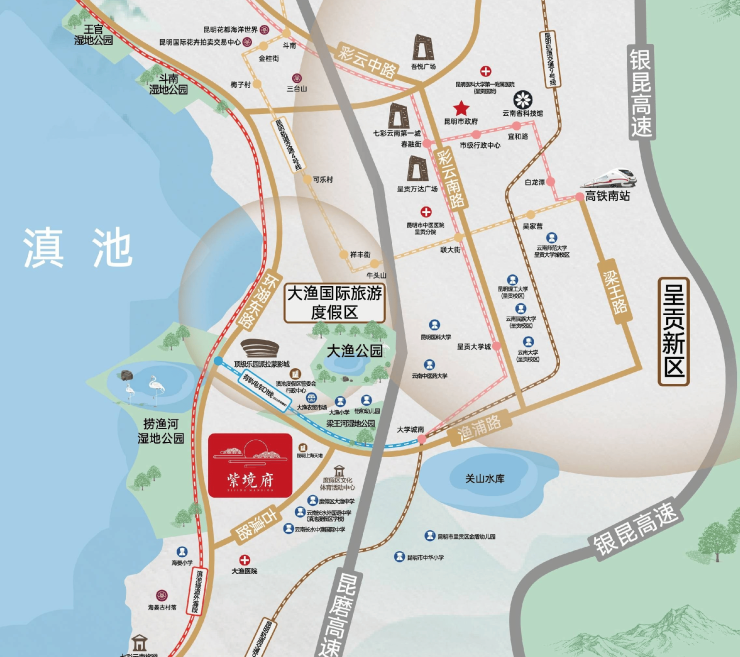 朗基·紫境府择址于高原滨湖休闲颐养胜地大渔板块,以“滇池旅游度假区”核心之地位,规划打造约5500亩的、集主题公园、教育、康养医疗、文化体育等汇聚的大渔国际旅游度假区。