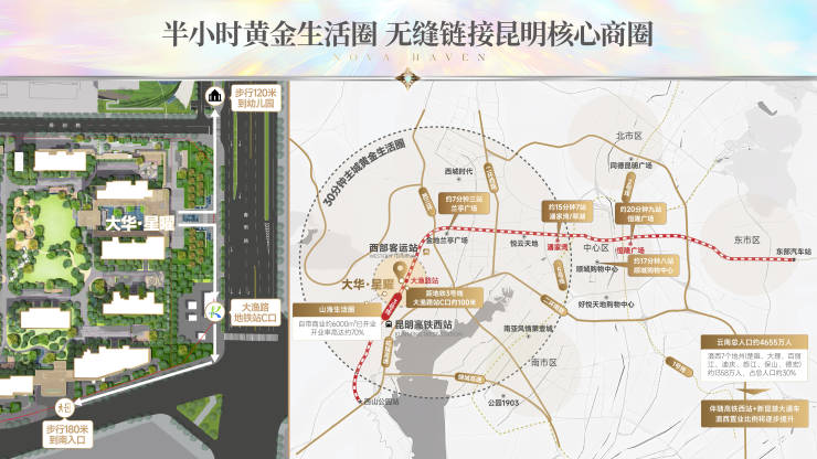 片区距离昆明市区仅7公里,昆明西客站仅约2公里,地铁3号线C站口仅约50米,兰亭广场,悦云天地购物公园,南亚商圈,南屏街商圈,恒隆商圈触手可及。