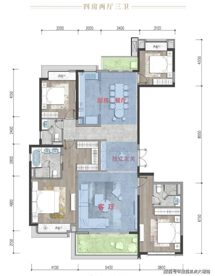 ▲锦粼天序205㎡户型图,205㎡户型,4房2厅3卫设计,多开间朝南;