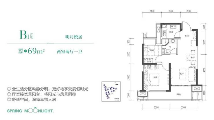 ▽B1户型/ 建筑面积约 69㎡ 两室两厅一卫