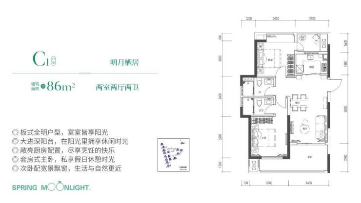 ▽C1户型/ 建筑面积约86㎡ 两室两厅两卫