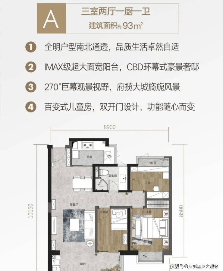 ❤A户型:建面约93㎡(三室两厅一卫)2T4户,