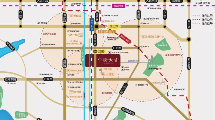 地铁:地铁2号线小街站下楼即享 路网:三横(二环南路,日新路,广福路)三纵(前兴路,官南大道,北京路南延线),10分钟到达海埂公园,10分钟至南亚、万达商圈30分钟至机场,高铁站
