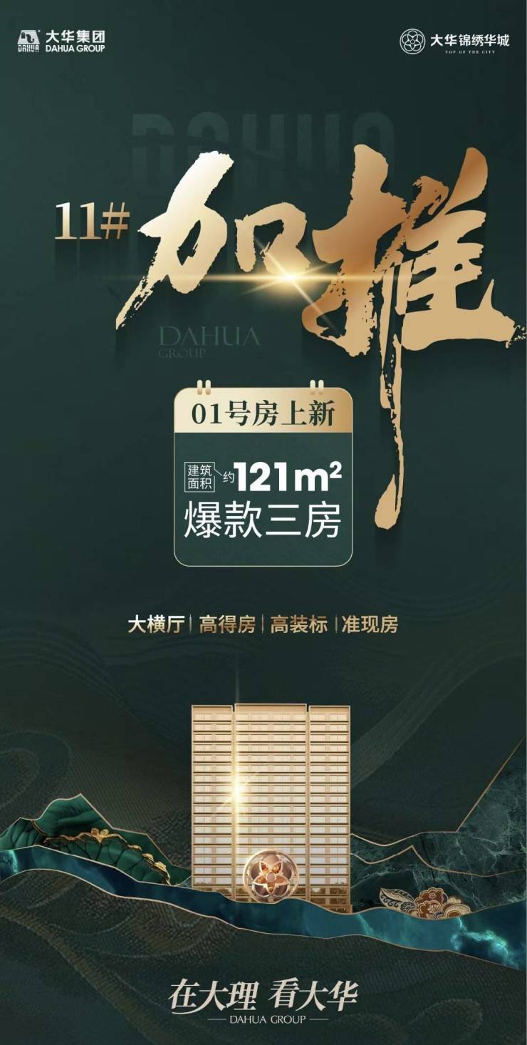 大理大华·锦绣华城,11#建筑面积约121㎡爆款三房加推,大横厅,高得房,高装标,准现房!关注大理大华·锦绣华城的朋友可前往售楼处现场看房,咨询房源信息请拨打电话400-156-0036 转 406879!